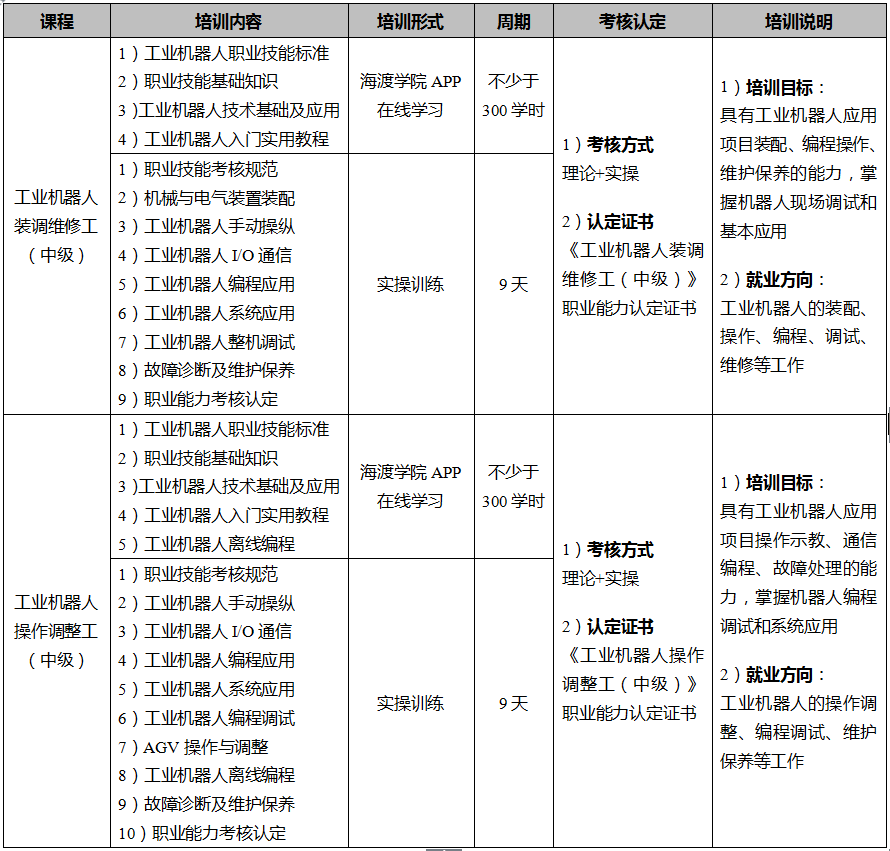 江苏哈工海渡工业机器人有限公司是哈工大机器人集团(HRG)旗下唯一一家专注于工业机器人教育装备与教学体系建设的子公司,是机械工业职业技能鉴定指导中心授权的机械行业智能制造工业机器人实训基地,可在智能制造领域开展“工业机器人装调维修工(中级、高级、技师)”、“工业机器人操作调整工(中级、高级、技师)”培训和职业能力认定工作。